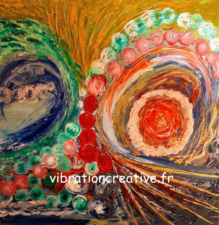 Derrière les mouvements abstraits et la richesse de la matière se cache une histoire universelle : celle de la fusion amoureuse. Dans la spirale incandescente de droite, l'artiste a voulu capturer ce moment précis où deux âmes se rencontrent et s'enveloppent pour ne former qu'un tout. Les couleurs chaudes et vibrantes célèbrent la passion, tandis que le mouvement circulaire crée un cocon protecteur et intime.