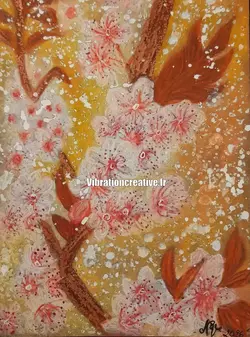 Technique et Texture : Le travail semble faire appel à des techniques mixtes. On note des projections (splatter) qui apportent de la spontanéité et du mouvement, simulant le pollen ou une brise légère. La texture granuleuse et les rehauts de blanc pur sur les pétales donnent une impression de relief et de luminosité intense.